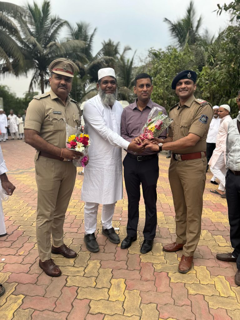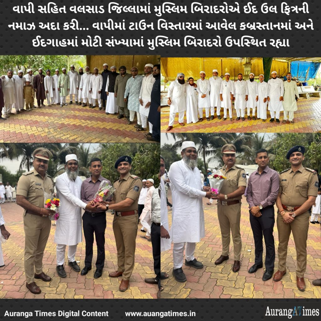 ઉલ્લેખનીય છે કે આજના ઇદ ઉલ ફિત્ર ની નમાઝ માટે વાપીમાં ટાઉન વિસ્તારમાં આવેલ ઈદગાહ ઉપરાંત, સી’ ટાઈપ, ડુંગરા ઈદગાહ તેમજ તમામ મસ્જિદમાં મુસ્લિમ બિરાદરોએ ઇદની નમાઝ અદા કરી એકબીજાને ગળે લગાડી ઇદની શુભકામના પાઠવી હતી. આ પ્રસંગે કાયદો વ્યવસ્થા જાળવવા ખડેપગે રહેનાર વાપી ટાઉનના PI સહિતના પોલીસ અધિકારીઓનું પણ સન્માન કરવામાં આવ્યું હતું.