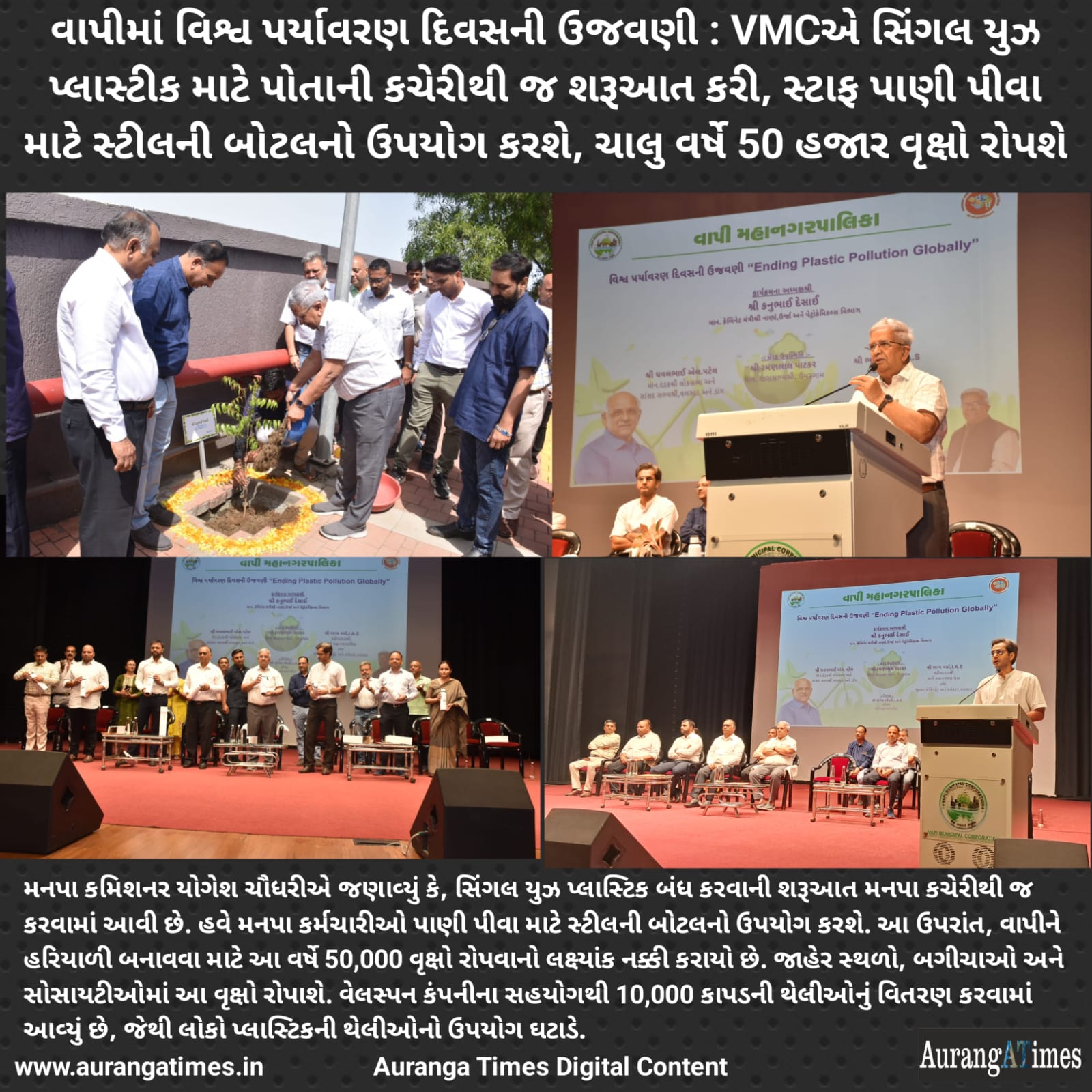 આજે 5 જૂન, વિશ્વ પર્યાવરણ દિવસના અવસરે વાપી મહાનગરપાલિકાએ પર્યાવરણ સુરક્ષા માટે નોંધપાત્ર પગલાંઓની શરૂઆત કરી છે. રાજ્યના નાણાં, ઊર્જા અને પેટ્રોકેમિકલ્સ મંત્રી કનુભાઈ દેસાઈની અધ્યક્ષતામાં વાપીમાં એક ભવ્ય કાર્યક્રમ યોજાયો, જેમાં પર્યાવરણ સંરક્ષણ માટેની પહેલોની જાહેરાત કરવામાં આવી.