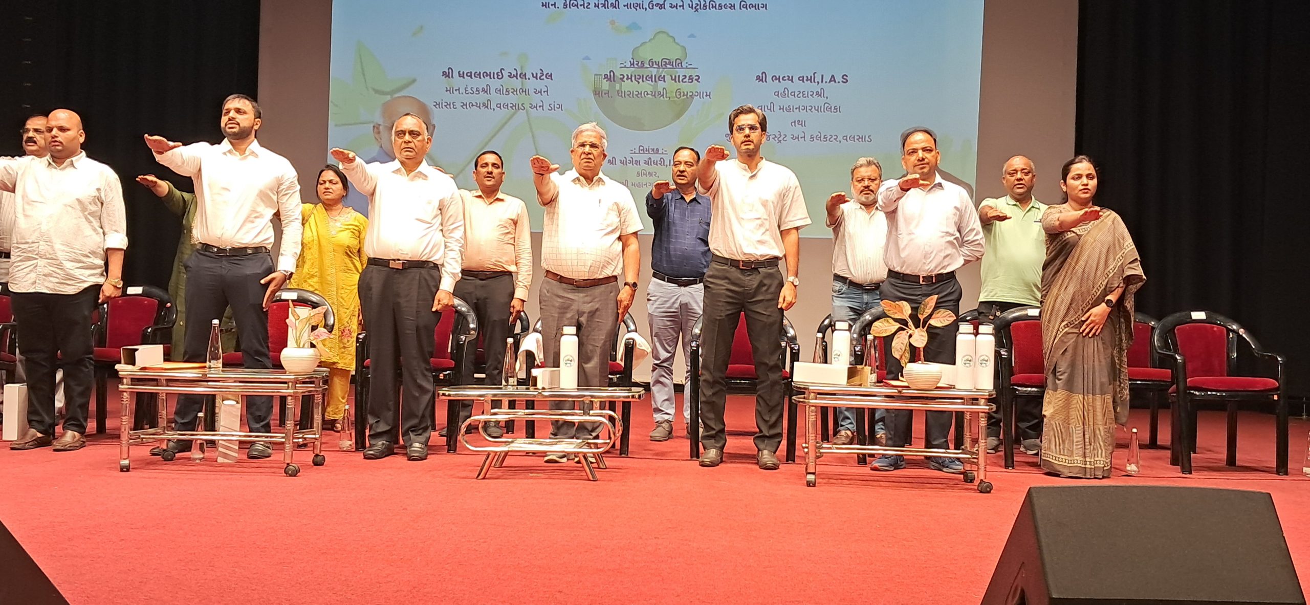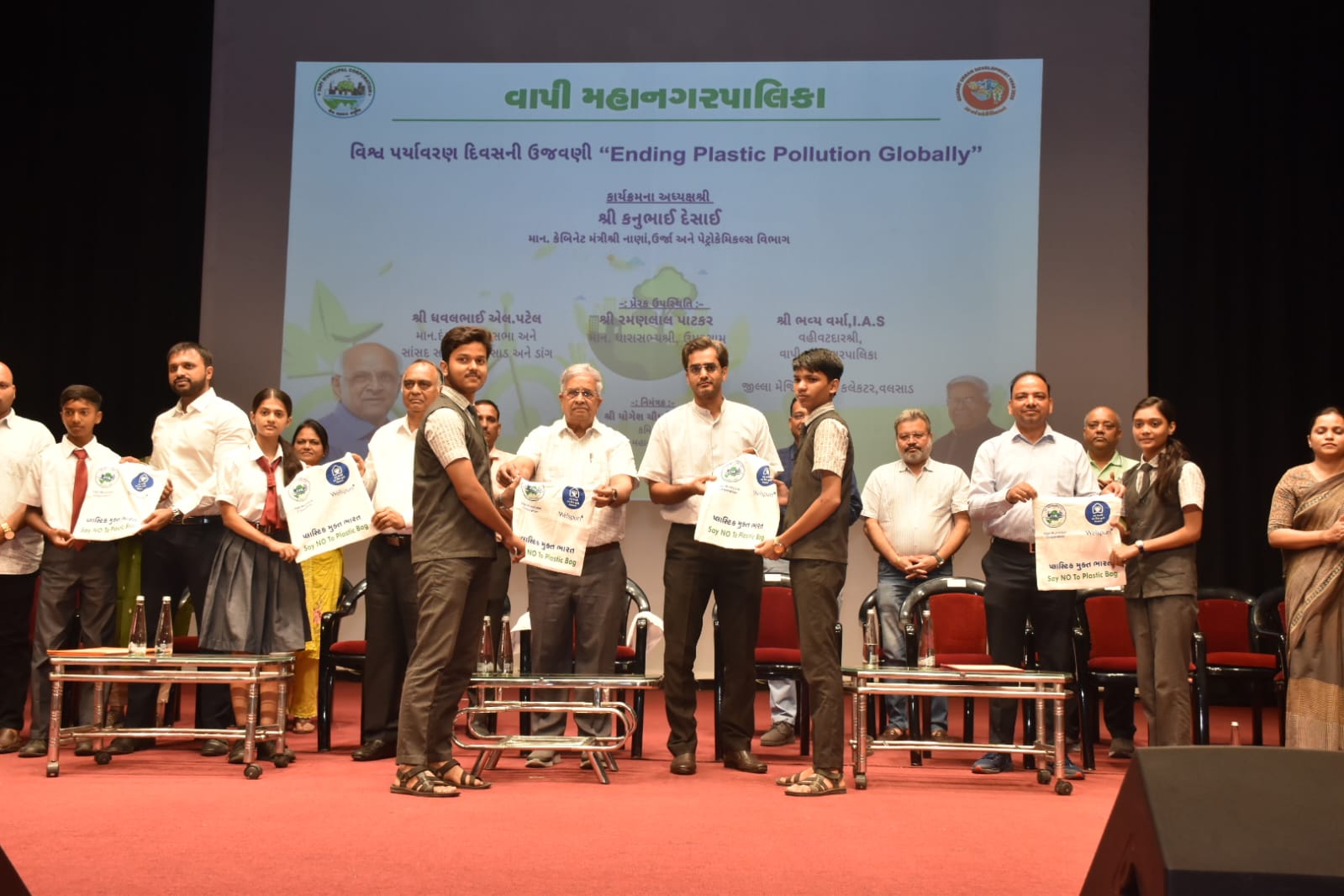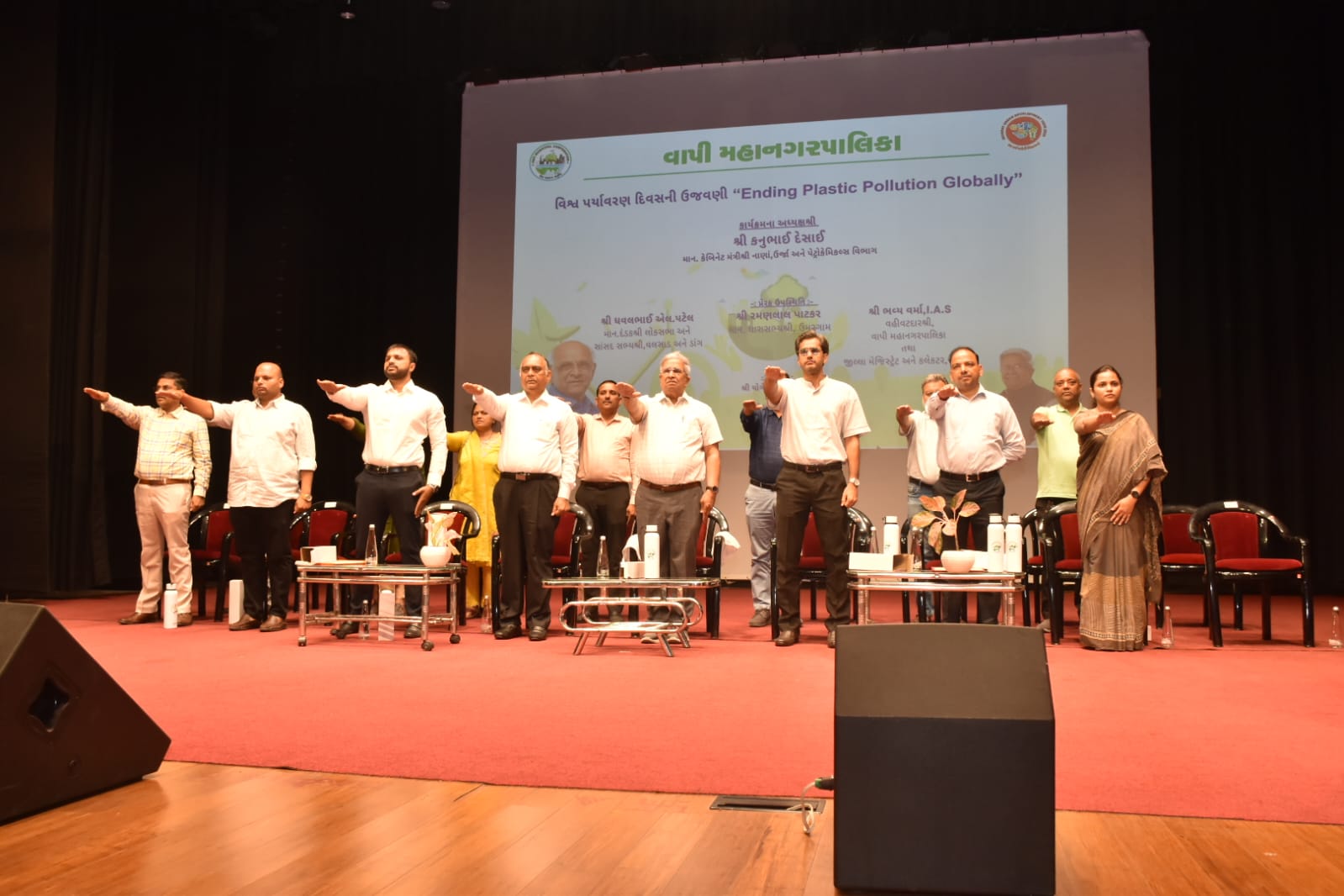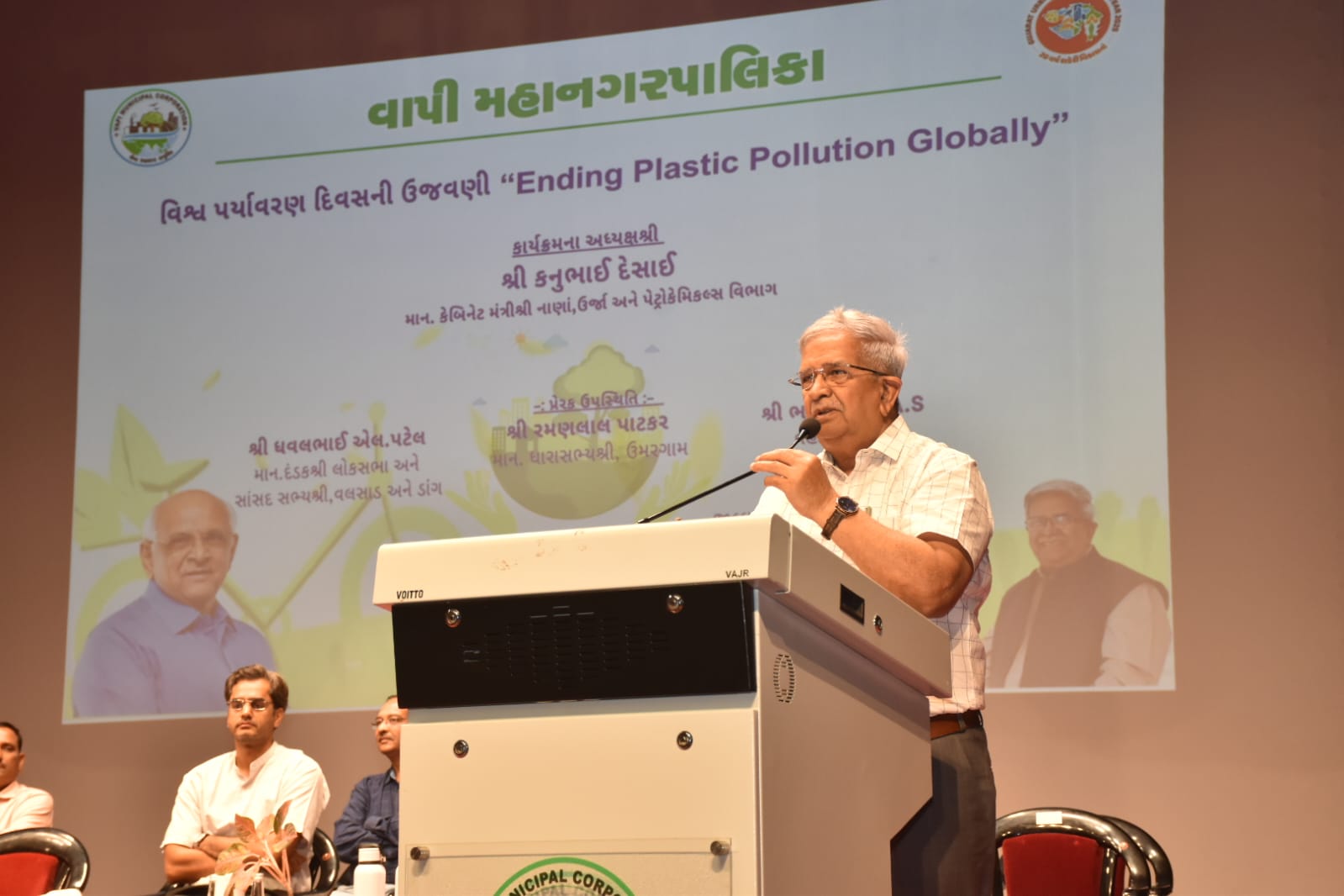 વાપીના પદ્મભૂષણ રજ્જુભાઈ શ્રોફ ઓડિટોરિયમમાં આયોજિત વિશ્વ પર્યાવરણ દિવસના કાર્યક્રમમાં મંત્રી કનુભાઈ દેસાઈએ ગ્લોબલ વોર્મિંગ અને ક્લાઈમેટ ચેન્જની સમસ્યાઓ પર ધ્યાન દોર્યું. તેમણે જણાવ્યું કે, વડાપ્રધાન નરેન્દ્રભાઈ મોદીએ ક્લાઈમેટ ચેન્જ ડિપાર્ટમેન્ટ અને સોલાર પોલીસીની શરૂઆત કરી, જેનાથી વૈશ્વિક સ્તરે જાગૃતિ વધી છે.