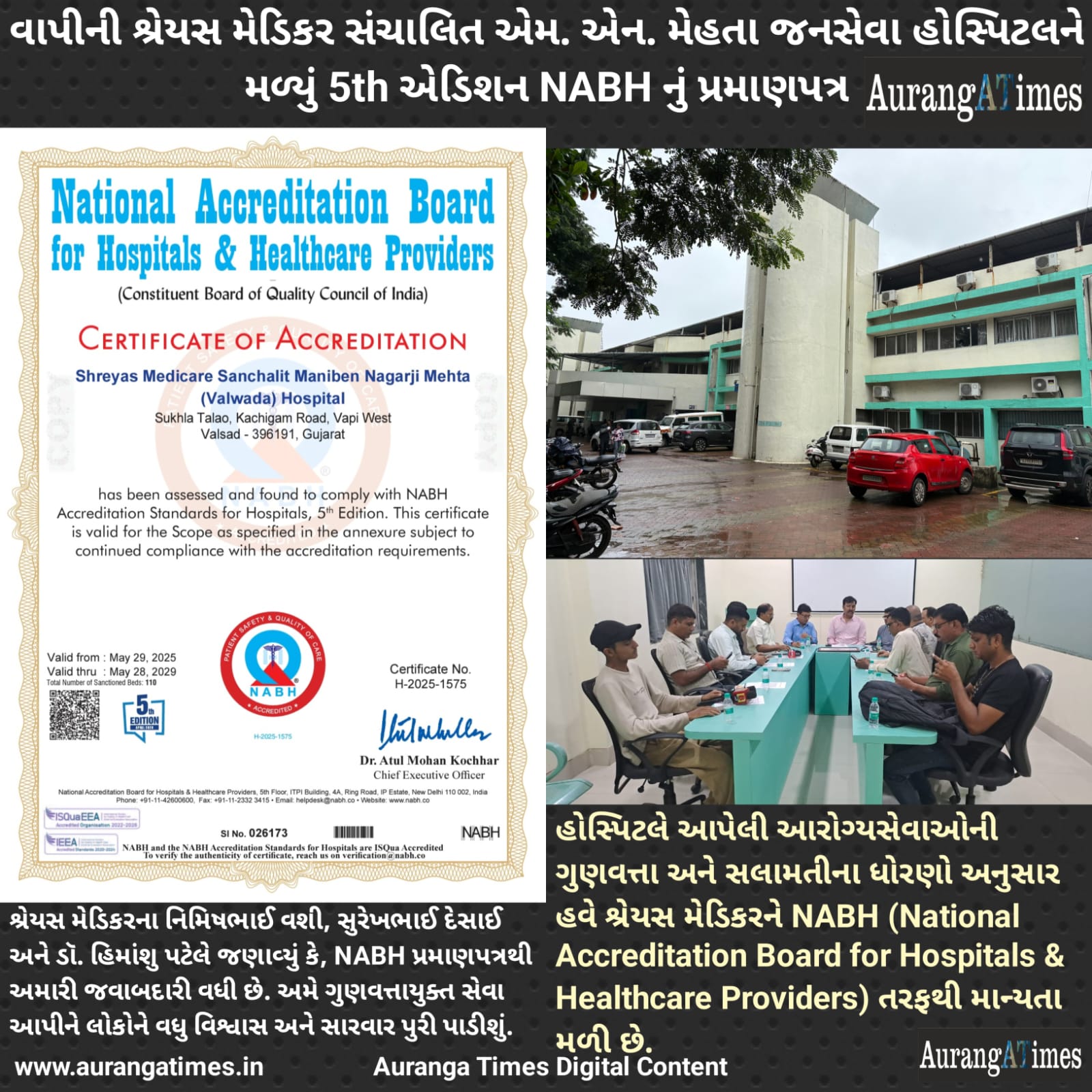 વાપી તેમજ આજુબાજુના વિસ્તારોના દર્દીઓને ખૂબ જ રાહતદાયક તબીબી સેવા આપતી શ્રેયસ મેડિકર સંચાલિત એમ એન મેહતા જનસેવા હોસ્પિટલે આરોગ્ય ક્ષેત્રમાં એક મહત્વપૂર્ણ માઇલસ્ટોન પ્રાપ્ત કર્યો છે. હોસ્પિટલે આપેલી આરોગ્યસેવાઓની ગુણવત્તા અને સલામતીના ધોરણો અનુસાર હવે શ્રેયસ મેડિકરને NABH (National Accreditation Board for Hospitals & Healthcare Providers) તરફથી માન્યતા મળી છે.