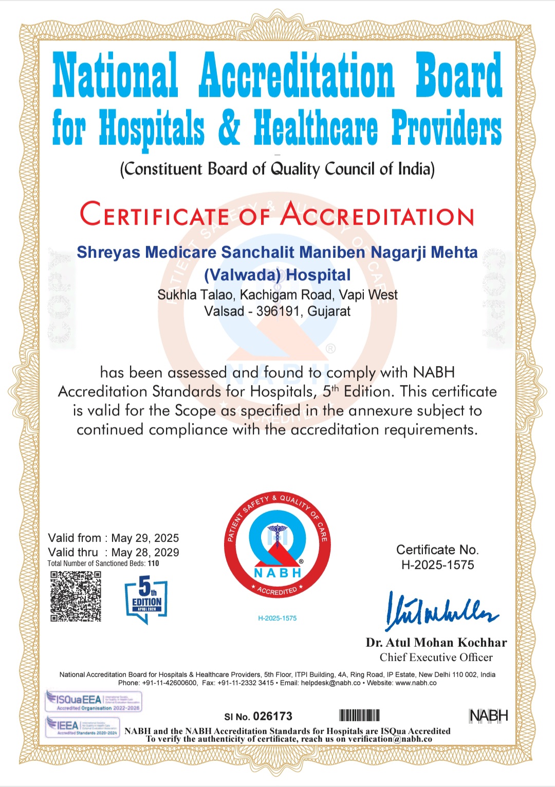 આ પ્રમાણપત્ર એ શ્રેયસ મેડિકરમાં દર્દીઓ માટે ઉચ્ચ સ્તરની સારવાર, સ્વચ્છતા, દર્દી સુરક્ષા અને મેનેજમેન્ટની શ્રેષ્ઠ પ્રક્રિયાઓ અમલમાં આવી હોવાનું પ્રમાણ છે. NABH પ્રમાણપત્ર મેળવવું કોઈપણ હોસ્પિટલ માટે પ્રતિષ્ઠાનું અને પ્રતિબદ્ધતાનું ચિહ્ન છે.