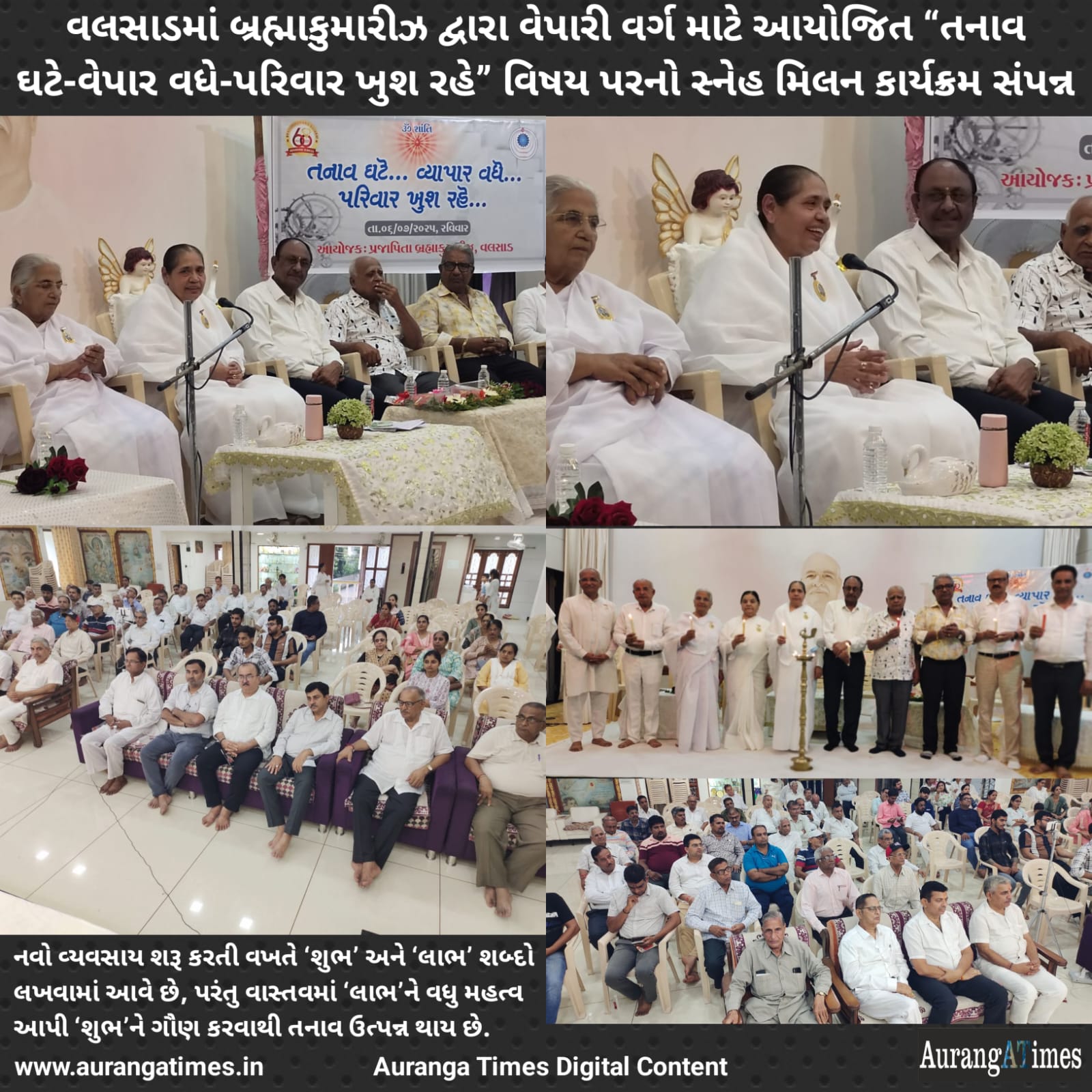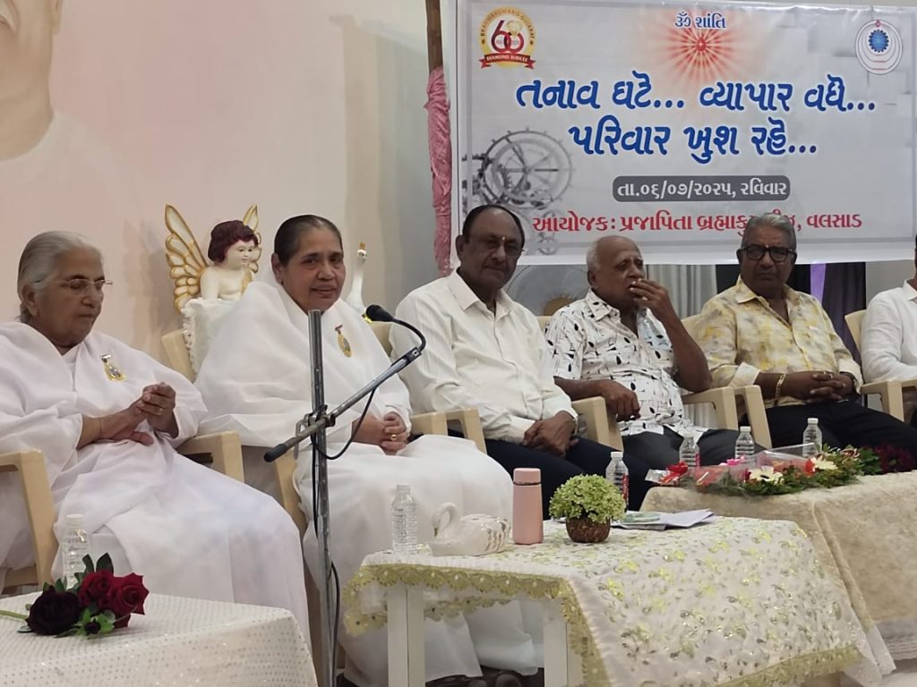 વલસાડ: જ્ઞાન સૂર્ય ભવન, વલસાડ ખાતે બ્રહ્માકુમારીઝ સેવાકેન્દ્ર દ્વારા રવિવારે “તનાવ ઘટે-વેપાર વધે-પરિવાર ખુશ રહે” વિષય પર વેપારી વર્ગ માટે વિશેષ સ્નેહ મિલન કાર્યક્રમનું આયોજન કરવામાં આવ્યું હતું. આ કાર્યક્રમમાં ઈન્દોરથી ખાસ ઉપસ્થિત રાજયોગિની બ્ર.કુ. હેમલતાદીદી (ક્ષેત્રિય સંયોજક, વેપાર ઉદ્યોગ પ્રભાગ)એ માર્ગદર્શન આપ્યું હતું.
