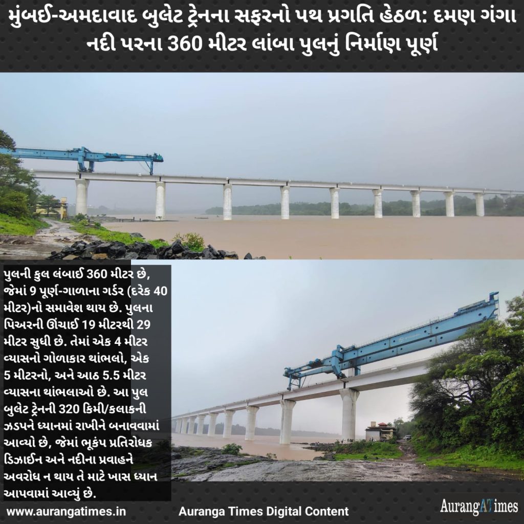 વલસાડ, 8 જુલાઈ 2025: ભારતના પ્રથમ બુલેટ ટ્રેન પ્રોજેક્ટ મુંબઈ-અમદાવાદ હાઈ-સ્પીડ રેલ કોરિડોરે એક મહત્વપૂર્ણ સીમાચિહ્ન હાંસલ કર્યું છે. ગુજરાતના વલસાડ જિલ્લામાં દમણ ગંગા નદી પર 360 મીટર લાંબા પુલનું નિર્માણ પૂર્ણ થયું છે, જે આ પ્રોજેક્ટ માટે 16મો નદી પુલ છે. આ સાથે, વલસાડ જિલ્લાના તમામ પાંચ નદી પુલો હવે તૈયાર થઈ ગયા છે.