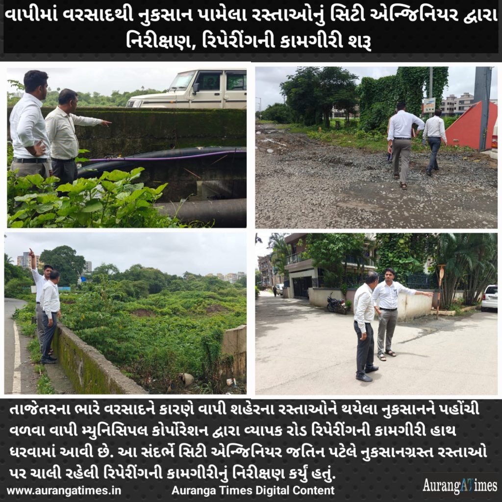 તાજેતરના ભારે વરસાદને કારણે વાપી શહેરના રસ્તાઓને થયેલા નુકસાનને પહોંચી વળવા વાપી મ્યુનિસિપલ કોર્પોરેશન દ્વારા વ્યાપક રોડ રિપેરીંગની કામગીરી હાથ ધરવામાં આવી છે. આ સંદર્ભે સિટી એન્જિનિયર જતિન પટેલે નુકસાનગ્રસ્ત રસ્તાઓ પર ચાલી રહેલી રિપેરીંગની કામગીરીનું નિરીક્ષણ કર્યું હતું.
