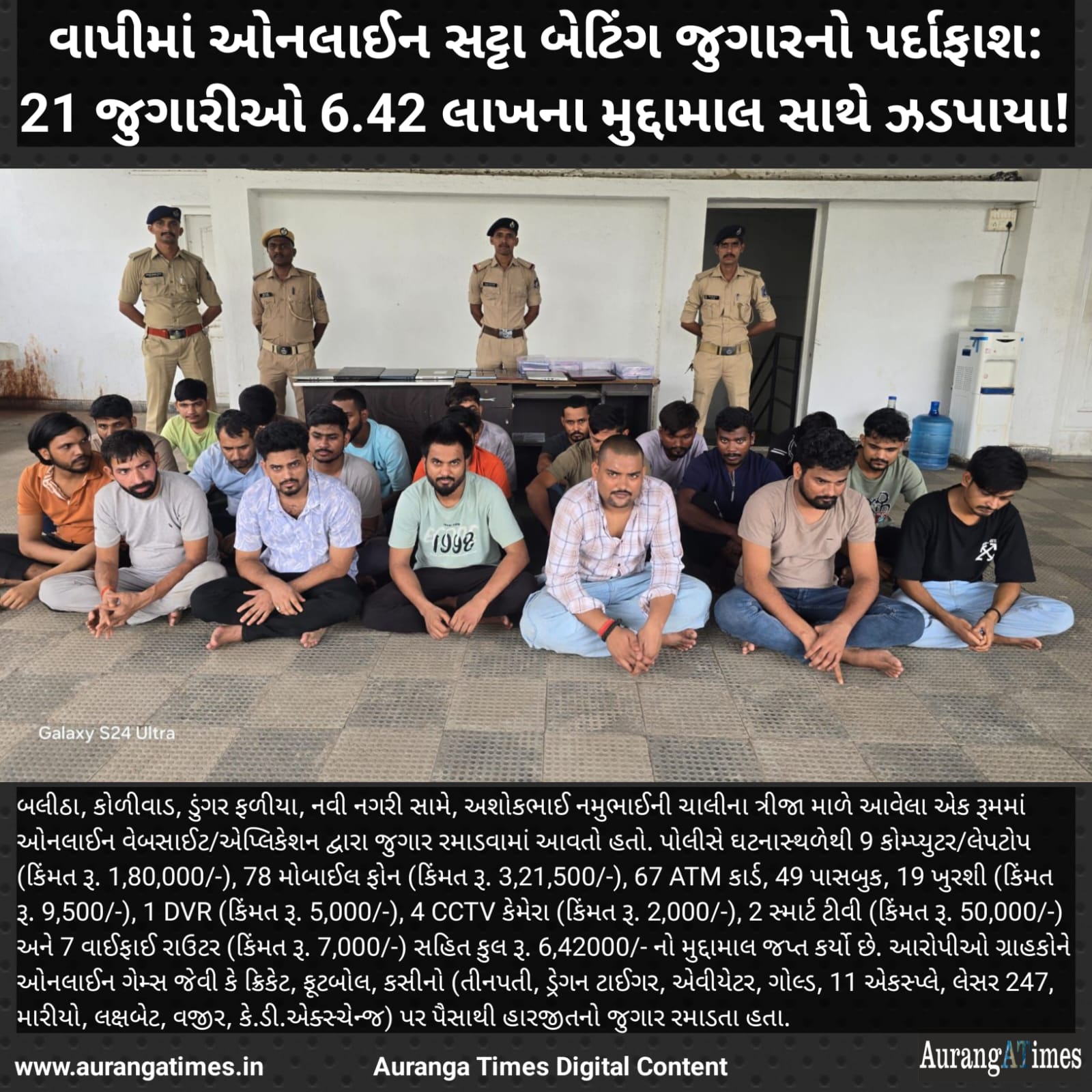 બલીઠા, કોળીવાડ, ડુંગર ફળીયા, નવી નગરી સામે, અશોકભાઈ નમુભાઈની ચાલીના ત્રીજા માળે આવેલા એક રૂમમાં ઓનલાઈન વેબસાઈટ/એપ્લિકેશન દ્વારા જુગાર રમાડવામાં આવતો હતો. પોલીસે ઘટનાસ્થળેથી 9 કોમ્પ્યુટર/લેપટોપ (કિંમત રૂ. 1,80,000/-), 78 મોબાઈલ ફોન (કિંમત રૂ. 3,21,500/-), 67 ATM કાર્ડ, 49 પાસબુક, 19 ખુરશી (કિંમત રૂ. 9,500/-), 1 DVR (કિંમત રૂ. 5,000/-), 4 CCTV કેમેરા (કિંમત રૂ. 2,000/-), 2 સ્માર્ટ ટીવી (કિંમત રૂ. 50,000/-) અને 7 વાઈફાઈ રાઉટર (કિંમત રૂ. 7,000/-) સહિત કુલ રૂ. 6,42000/- નો મુદ્દામાલ જપ્ત કર્યો છે.