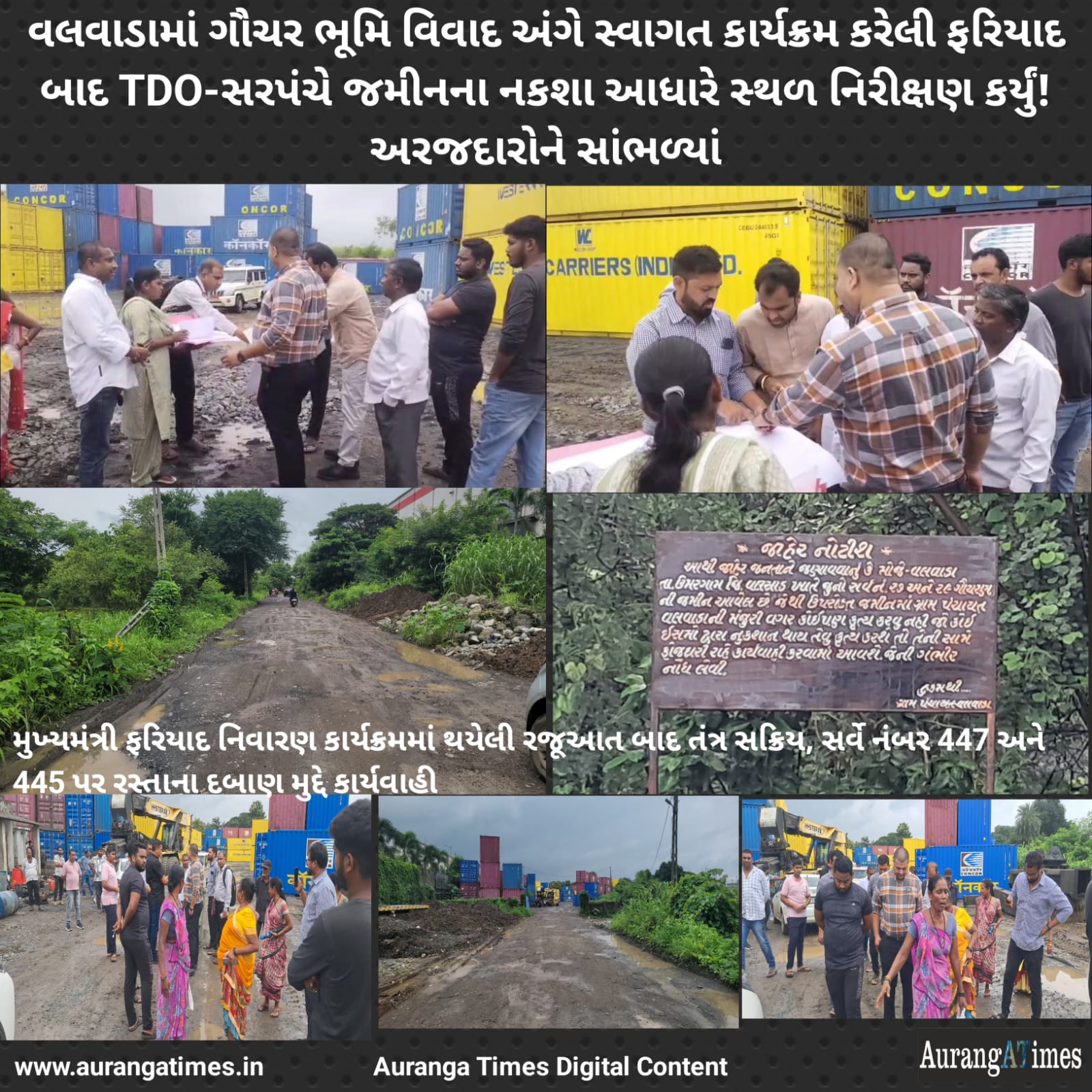 આ જ નોટિસના અનુસંધાને અને સમગ્ર મામલાની ગંભીરતાને ધ્યાને લઈ, ઉમરગામ તાલુકા વિકાસ અધિકારી વિશાલ પટેલ, તલાટી કમ મંત્રી અને વલવાડા ગામના સરપંચ જયેશ પટેલ, ગ્રામ પંચાયત સભ્ય પ્રવેશ પટેલ દ્વારા વિવાદિત ગૌચર જમીનની રૂબરૂ મુલાકાત લીધી હતી. તેમણે સ્થળ પરની પરિસ્થિતિનું બારીકાઈથી નિરીક્ષણ કર્યું હતું અને સમગ્ર મામલે મીડિયાને પણ જાણકારી પૂરી પાડી હતી.