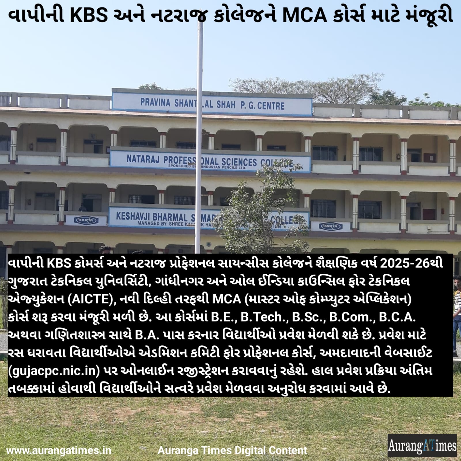 વાપીની KBS કોમર્સ અને નટરાજ પ્રોફેશનલ સાયન્સીસ કોલેજને શૈક્ષણિક વર્ષ 2025-26થી ગુજરાત ટેકનિકલ યુનિવર્સિટી, ગાંધીનગર અને ઓલ ઈન્ડિયા કાઉન્સિલ ફોર ટેકનિકલ એજ્યુકેશન (AICTE), નવી દિલ્હી તરફથી MCA (માસ્ટર ઓફ કોમ્પ્યુટર એપ્લિકેશન) કોર્સ શરૂ કરવા મંજૂરી મળી છે.