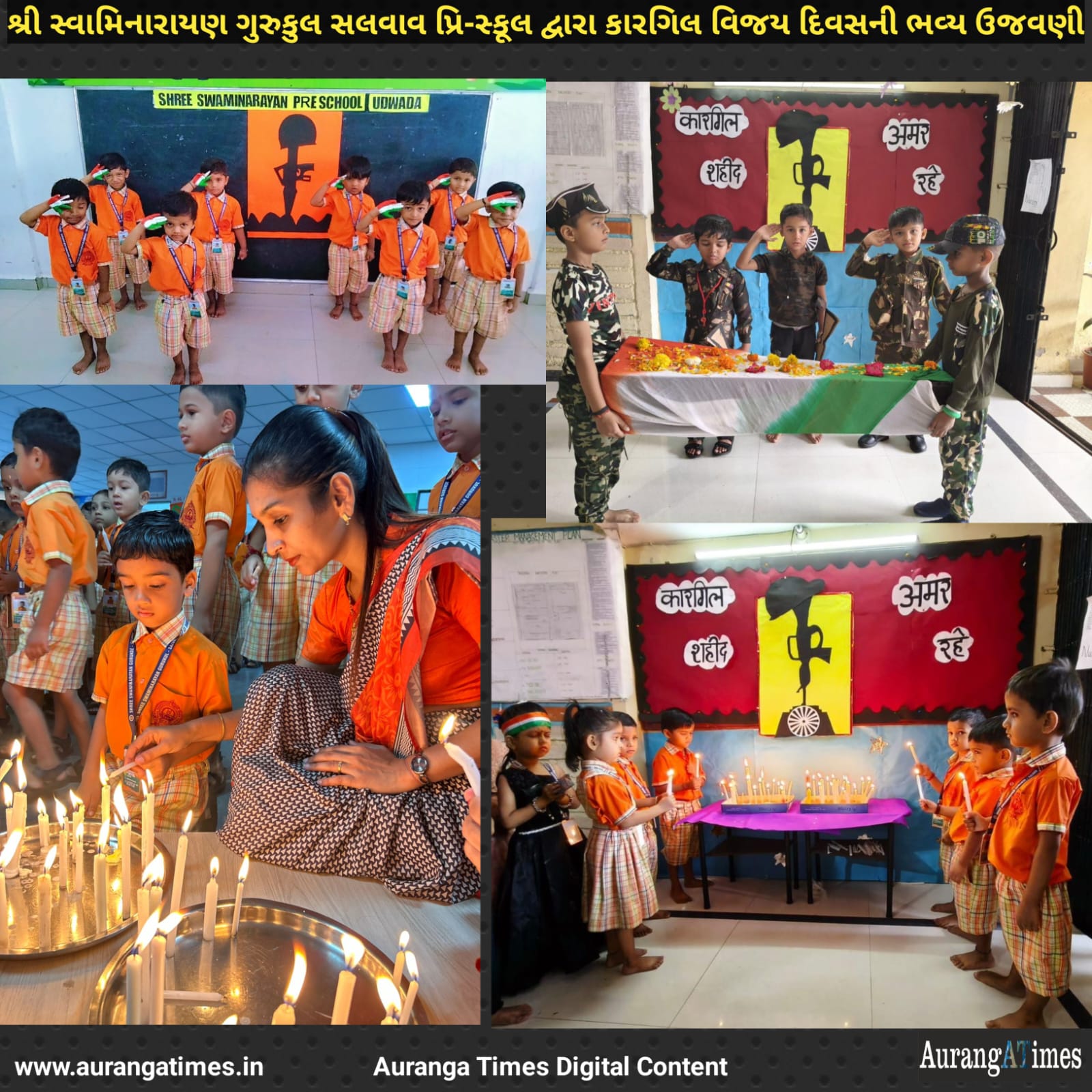 વાપી. શ્રી સ્વામિનારાયણ ગુરુકુલ સલવાવ પ્રિ-સ્કૂલ ખાતે ૨૬ જુલાઈ, ૨૦૨૫ના રોજ કારગિલ વિજય દિવસની ભવ્ય ઉજવણી કરવામાં આવી. શાળાના આચાર્યા શ્રીમતી નીતુ સિંહના માર્ગદર્શન હેઠળ આયોજિત આ કાર્યક્રમમાં વીર જવાનોના શૌર્ય અને પરાક્રમને યાદ કરી, દેશ માટે પોતાના પ્રાણોની આહુતિ આપનારા વીર શહીદોને શ્રદ્ધાંજલિ અર્પણ કરવામાં આવી.