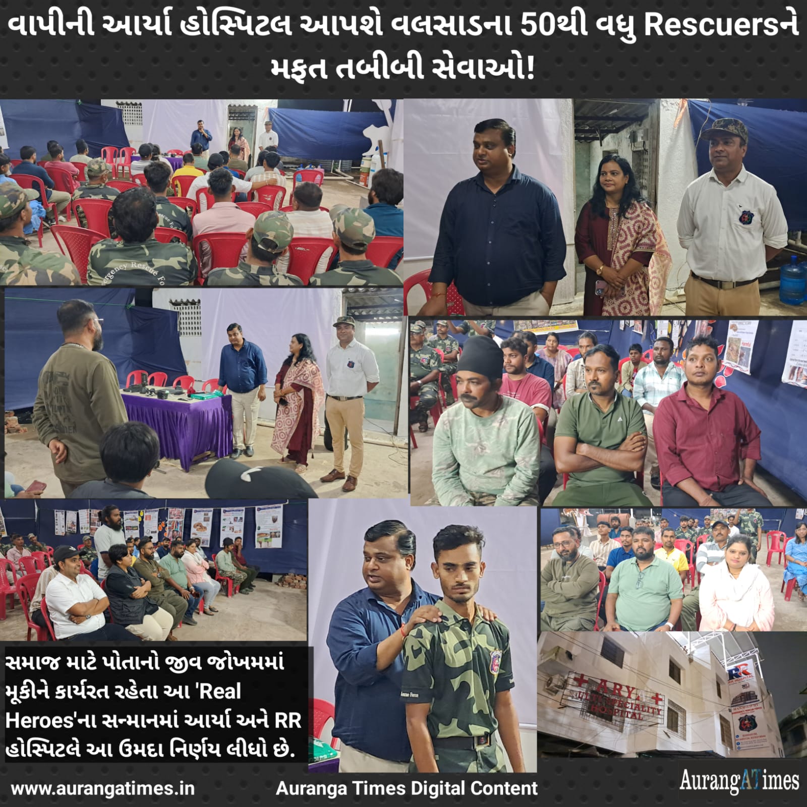વલસાડ જિલ્લાના 50થી વધુ રેસ્ક્યુઅર્સને આર્યા અને RR હોસ્પિટલની તબીબી સેવાઓનો મફત લાભ મળશે, જે તેમની સુરક્ષા અને કલ્યાણ સુનિશ્ચિત કરવા માટે એક મહત્વપૂર્ણ પહેલ છે. સમાજ માટે પોતાનો જીવ જોખમમાં મૂકીને કાર્યરત રહેતા આ ‘Real Heroes’ના સન્માનમાં આર્યા હોસ્પિટલે આ ઉમદા નિર્ણય લીધો છે.