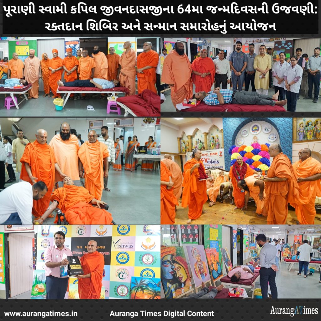 વાપી: શ્રી સ્વામિનારાયણ ગુરુકુળ, સલવાવના મેનેજિંગ ટ્રસ્ટી પૂજ્ય પૂરાણી સ્વામી કપિલ જીવનદાસજીના 64મા જન્મદિવસની ઉજવણી ધામધૂમથી કરવામાં આવી. આ પ્રસંગે વાપીના સલવાવ ગુરુકુળમાં રક્તદાન શિબિર અને સન્માન સમારોહનું આયોજન કરવામાં આવ્યું હતું, જેમાં મોટી સંખ્યામાં ભક્તો, વિદ્યાર્થીઓ અને સ્નેહીજનો જોડાયા હતા.