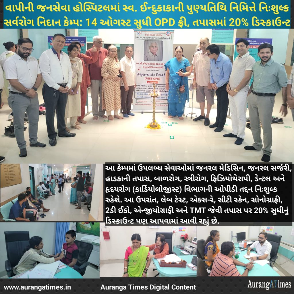 વાપી: વાપી સ્થિત શ્રેયસ મેડિકેર સંચાલિત એમ.એન. મહેતા (વલવાડા) જનસેવા હોસ્પિટલમાં સ્વ. શ્રી ઈન્દ્રવદનભાઈ શાહ (ઈન્દુકાકા)ની ચોથી પુણ્યતિથિ નિમિત્તે એક ભવ્ય નિઃશુલ્ક સર્વરોગ નિદાન શિબિરનું આયોજન કરવામાં આવ્યું છે.