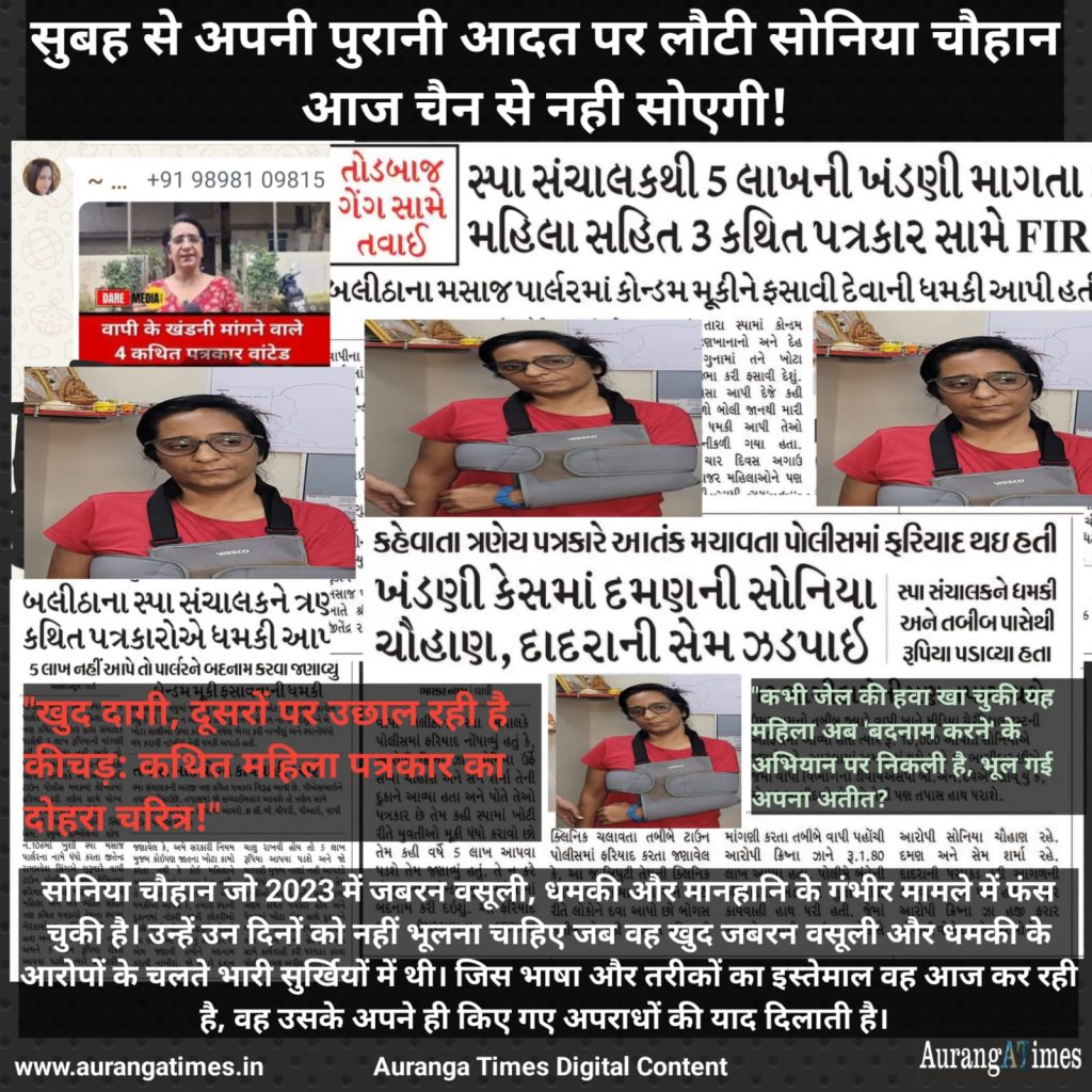 उस समय वापी में एक स्पा संचालक ने सोनिया चौहान समेत तीन लोगों के खिलाफ 5 लाख रुपये की जबरन वसूली की शिकायत दर्ज कराई थी। शिकायतकर्ता ने बताया था कि इन लोगों ने उसके मसाज पार्लर को बदनाम करने की धमकी दी थी और यहां तक कि दुकान में कंडोम रखकर यौन उत्पीड़न के झूठे आरोप लगाने की भी धमकी दी थी। पुलिस जांच में यह भी सामने आया था कि उन्होंने कथित तौर पर ‘मीडिया माफिया’ बनकर 1.80 लाख रुपये की उगाही की थी।