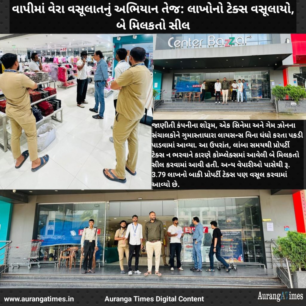 વાપી મહાનગરપાલિકાના ઘરવેરા વિભાગે કમિશનર યોગેશ ચૌધરીના માર્ગદર્શન હેઠળ એક વિશેષ અભિયાન ચલાવ્યું છે. આ અભિયાનનો મુખ્ય ઉદ્દેશ ગુમાસ્તાધારા લાયસન્સ, પ્રોફેશનલ ટેક્સ અને પ્રોપર્ટી ટેક્સની વસૂલાત કરવાનો છે.