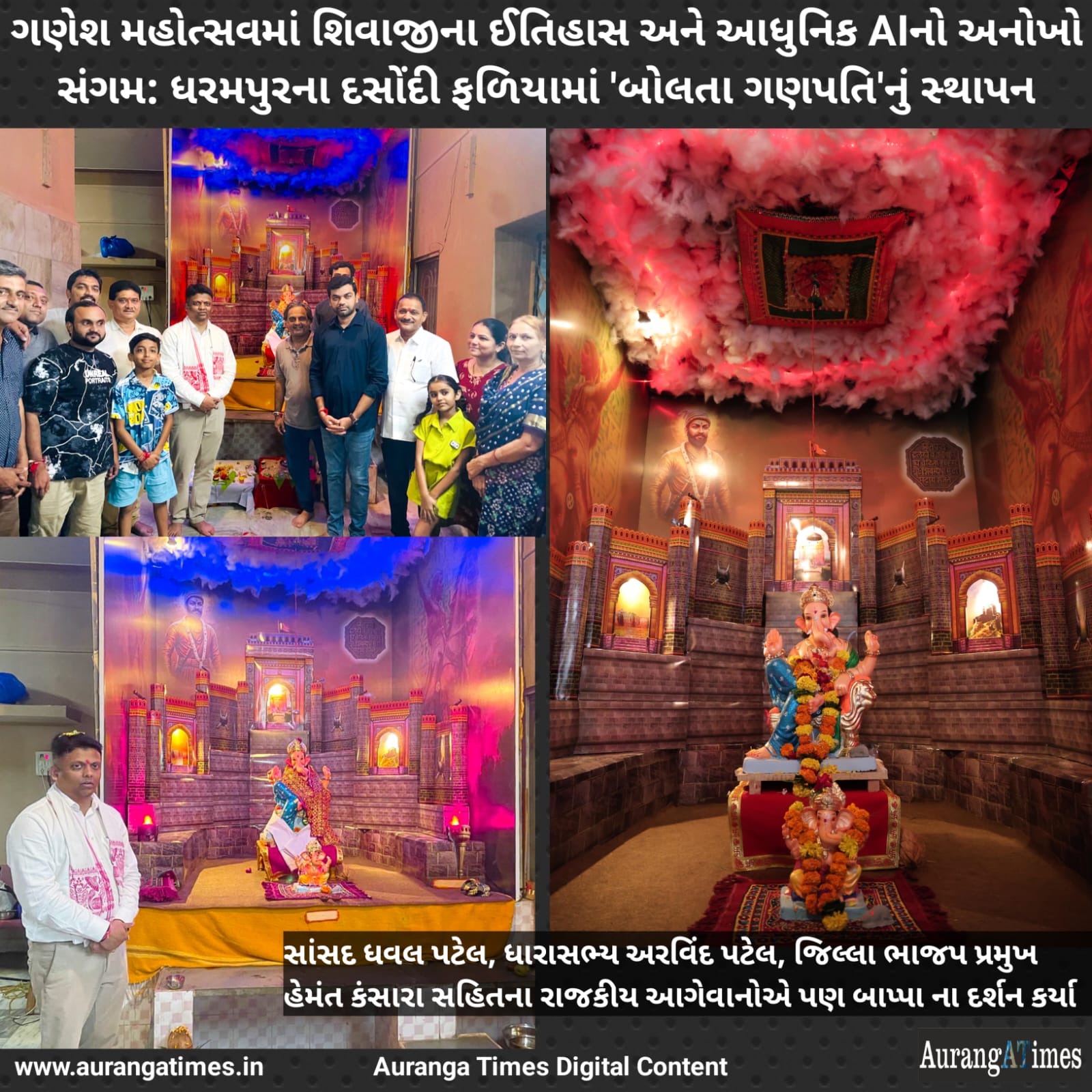 ધરમપુર, દસોંદી ફળિયું: ધરમપુરના દસોંદી ફળિયામાં આ વર્ષે ગણેશોત્સવ પરંપરા અને આધુનિકતાના અનોખા સંગમ સાથે ઉજવાઈ રહ્યો છે. યુવા શક્તિ યુવક મંડળ દ્વારા છત્રપતિ શિવાજી મહારાજના ઐતિહાસિક કિલ્લાની થીમ પર ભવ્ય સજાવટ કરવામાં આવી છે. આ સાથે, ભક્તો માટે ખાસ આકર્ષણનું કેન્દ્ર AI (આર્ટિફિશિયલ ઈન્ટેલિજન્સ) ગણપતિ બન્યા છે, જે ભક્તો સાથે વાતચીત કરી તેમને ધાર્મિક માર્ગદર્શન અને આશીર્વાદ આપે છે.