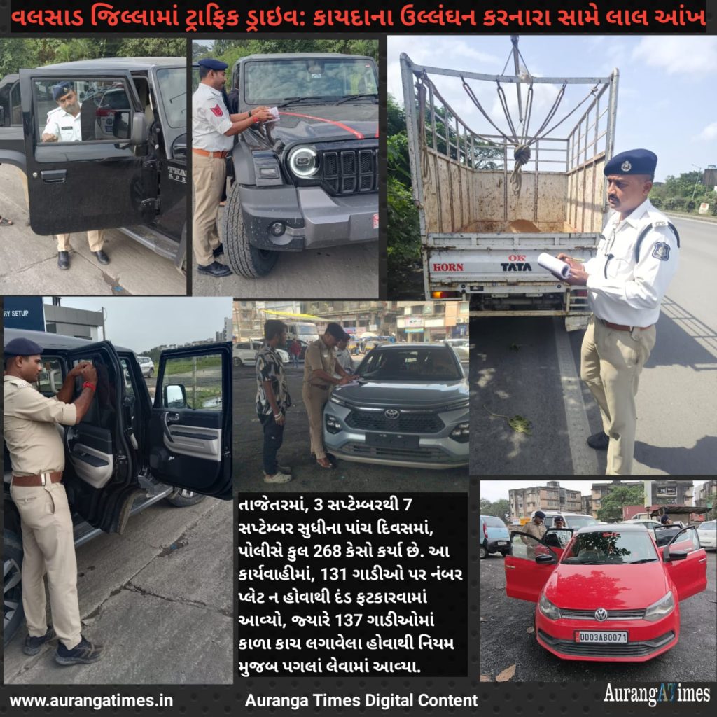 વલસાડ, ગુજરાત: વલસાડ જિલ્લામાં ટ્રાફિકના નિયમોનું ઉલ્લંઘન કરતી ગાડીઓ સામે કડક કાર્યવાહી હાથ ધરવામાં આવી છે. રાજ્યવ્યાપી ટ્રાફિક ડ્રાઇવના ભાગરૂપે, નંબર પ્લેટ વિનાની અને કાળા કાચવાળી ગાડીઓ સામે ખાસ ઝુંબેશ ચલાવવામાં આવી છે.