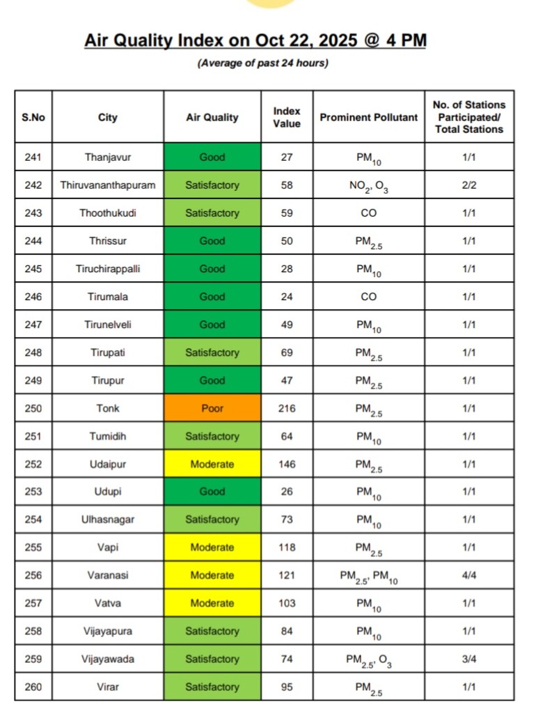 22 ઓક્ટોબરે વાપીનો AQI 118 (મોડરેટ) પર આવી, જે 21 ઓક્ટોબરના 255 (ખરાબ)થી નોંધપાત્ર સુધારો દર્શાવે છે—જાણે પ્રકૃતિએ શ્વાસ લેવાની છૂટ આપી! અમદાવાદ 139 (મોડરેટ) પર સ્થિર થયું, જે 21 ઓક્ટોબરના 192થી થોડું સારું છે. સુરત (157) અને વટવા (103) પણ મોડરેટ શ્રેણીમાં રહીને લોકોને રાહત આપી રહ્યા છે. આ સુધારો પ્રદૂષણ નિયંત્રણના પ્રયાસોની ઝલક જરૂર બતાવે છે.