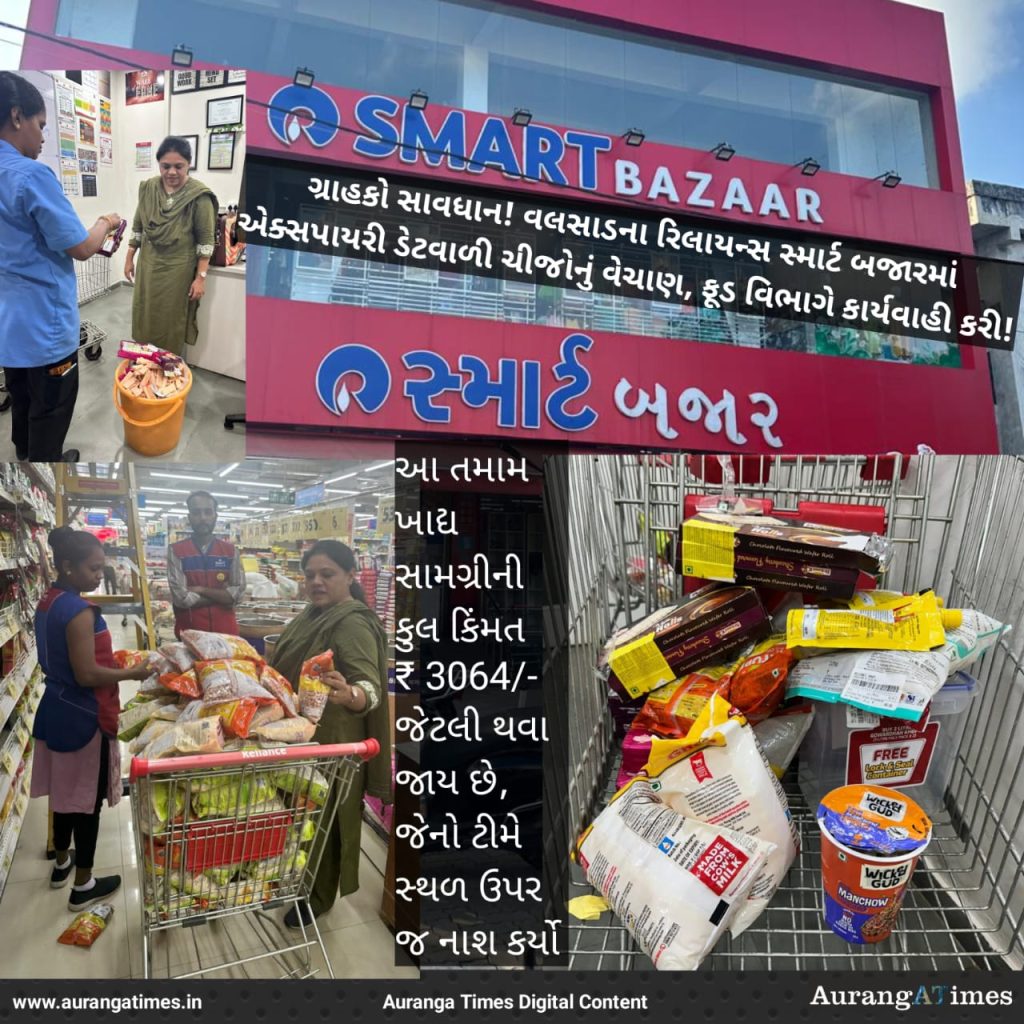 વલસાડના છીપવાડ ખાતે આવેલા રિલાયન્સ સ્માર્ટ બજારમાંથી આવ્યા છે. ગ્રાહકોના સ્વાસ્થ્ય સાથે ચેડાં થવાના ગંભીર આરોપો ! એક જાગૃત નાગરિક દ્વારા વલસાડ જિલ્લા ફૂડ એન્ડ ડ્રગ્સ વિભાગમાં ફરિયાદ કરવામાં આવી હતી કે, સ્માર્ટ બજારમાં હલકી ગુણવત્તાવાળી અને એક્સપાયરી ડેટ વીતી ગયેલી ખાદ્ય ચીજોનું ડિસ્કાઉન્ટમાં વેચાણ કરવામાં આવી રહ્યું છે.