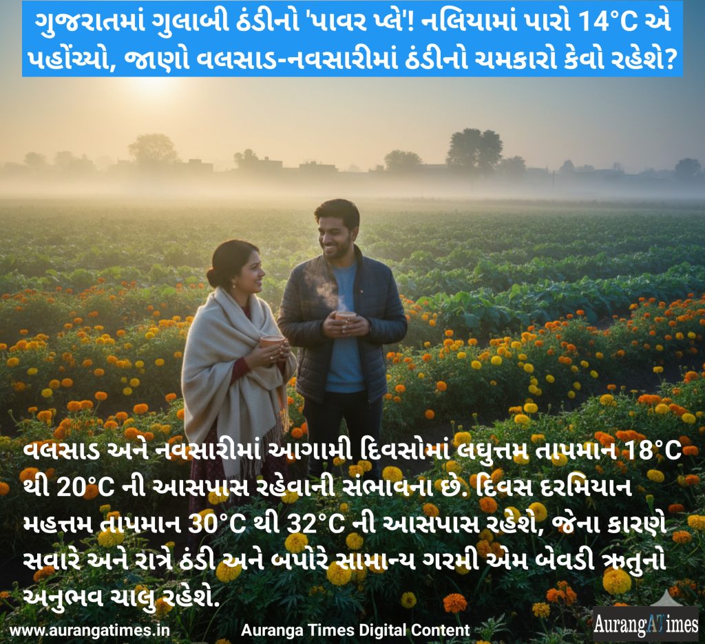 વલસાડ અને નવસારીમાં આગામી દિવસોમાં લઘુત્તમ તાપમાન 18°C થી 20°C ની આસપાસ રહેવાની સંભાવના છે. દિવસ દરમિયાન મહત્તમ તાપમાન 30°C થી 32°C ની આસપાસ રહેશે, જેના કારણે સવારે અને રાત્રે ઠંડી અને બપોરે સામાન્ય ગરમી એમ બેવડી ઋતુનો અનુભવ ચાલુ રહેશે.