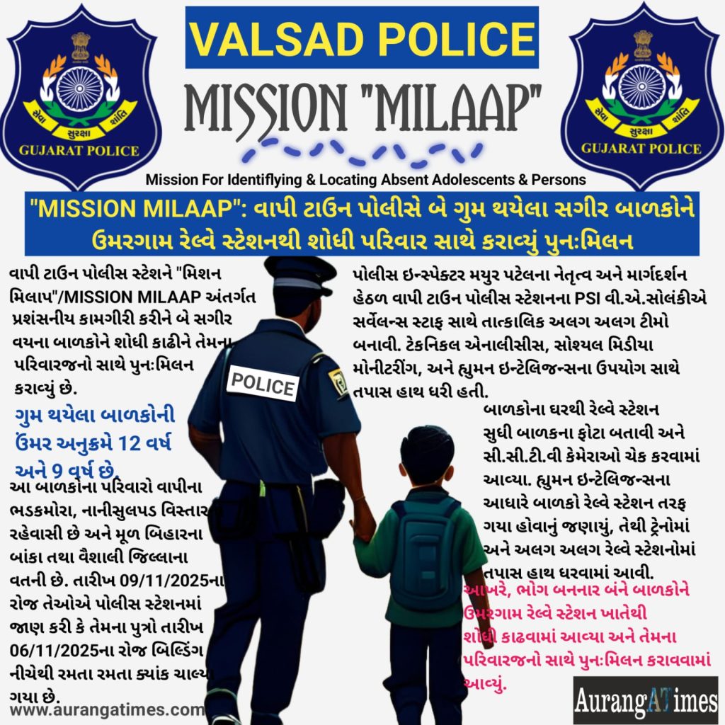 વાપી ટાઉન પોલીસ સ્ટેશને “મિશન મિલાપ”/MISSION MILAAP અંતર્ગત પ્રશંસનીય કામગીરી કરીને બે સગીર વયના બાળકોને શોધી કાઢીને તેમના પરિવારજનો સાથે પુનઃમિલન કરાવ્યું છે.