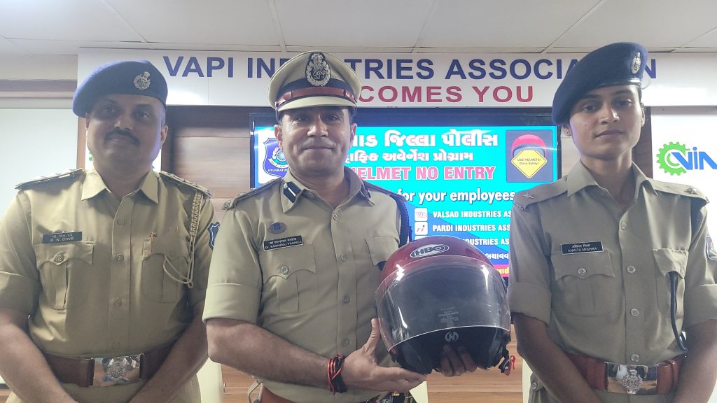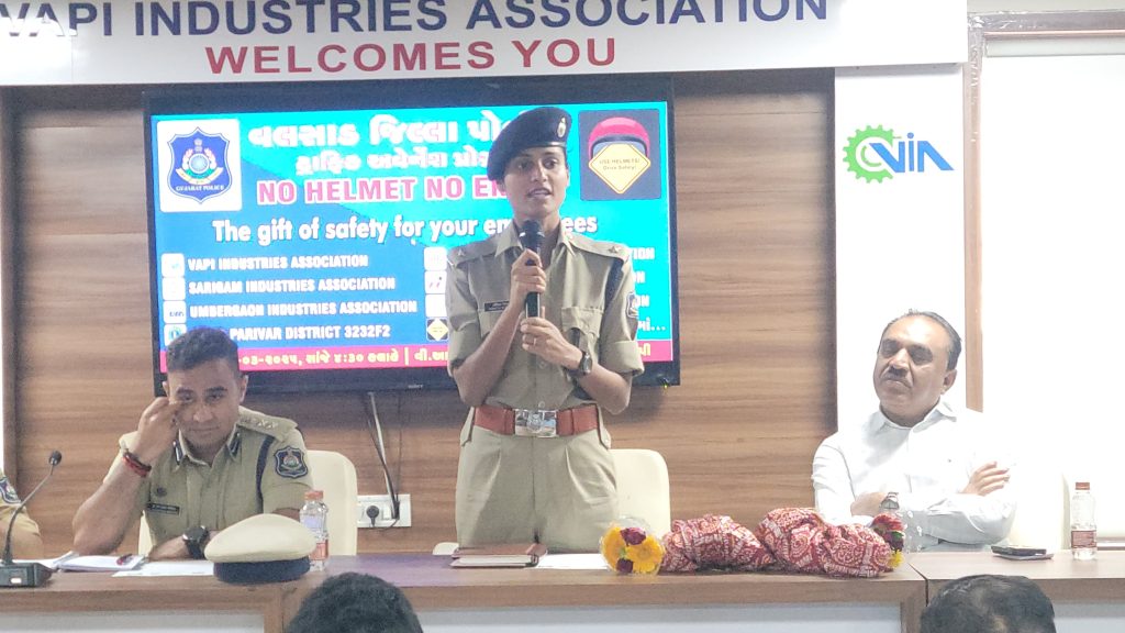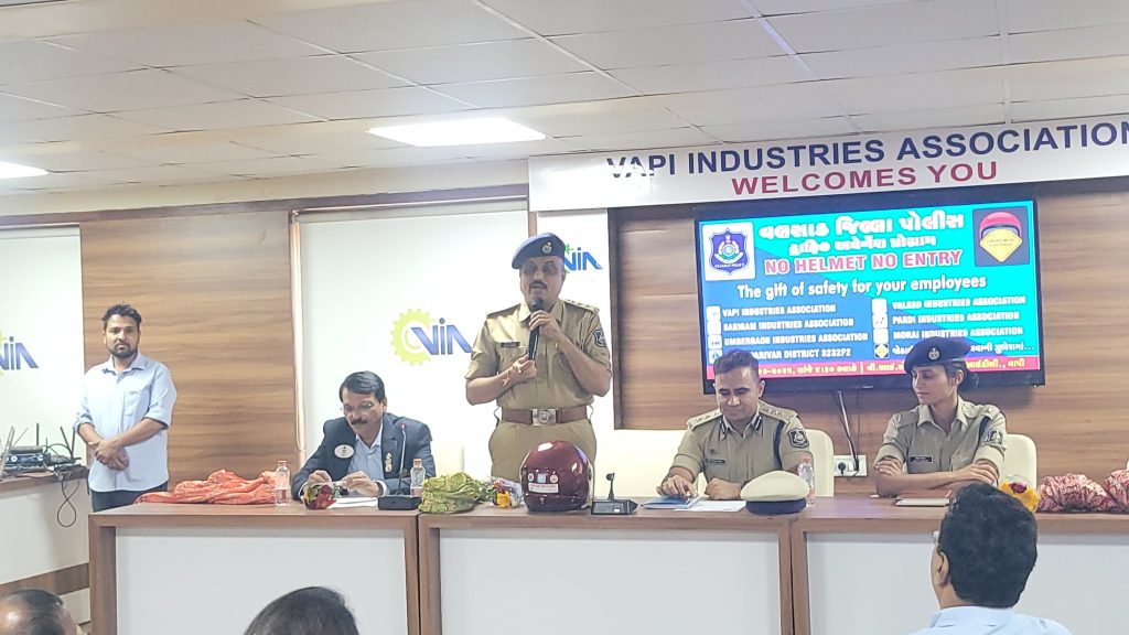 વલસાડ જિલ્લામાં બનતા અકસ્માતોને રોકવા પોલીસ વિભાગ દ્વારા વિવિધ ઇન્ડસ્ટ્રીઝ એસોસિએશન સાથે અને લાયન્સ પરિવારના સહયોગમાં જિલ્લાના ઉધોગોમાં “NO HELMET, NO ENTRY” અભિયાન શરૂ કરવામાં આવ્યું છે. જે અંતર્ગત વાપીના VIA હોલ ખાતે SP ડૉ. કરણરાજ વાઘેલાની અધ્યક્ષતામાં વિશેષ Traffic Awareness Sessionનું આયોજન કરવામાં આવ્યું હતું. આ સેમિનારમાં વિવિધ ઉદ્યોગોના 300 જેટલા સંચાલકો ઉપસ્થિત રહ્યા હતાં. જેઓને આ અભિયાન હેઠળ ઉપયોગી માર્ગદર્શન આપવામાં આવ્યું હતું.