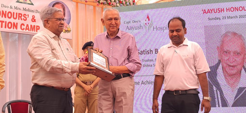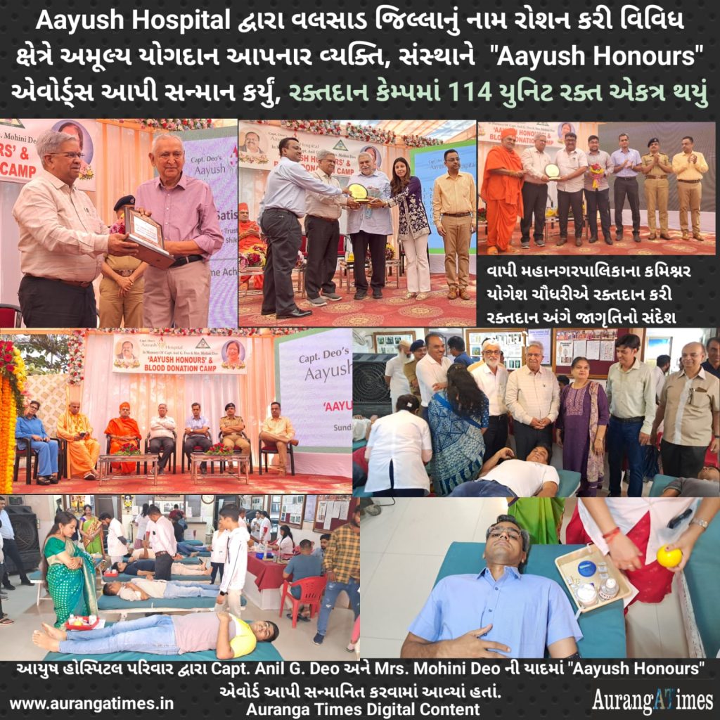 તારીખ 23 માર્ચ 2025ના આયુષ હોસ્પિટલ દ્વારા આયુષ ઓનર્સ એવોર્ડ્સ સન્માન સત્કાર સમારોહ તથા બ્લડ ડોનેશન કેમ્પનું આયોજન કરવામાં આવ્યું હતું. જેમાં 114 યુનિટ રક્ત એકત્રિત કરવામાં આવ્યું હતું. સાથે જ સંગીત, ઉદ્યોગ, પર્યાવરણ, રમતગમત, આરોગ્યક્ષેત્રે, મીડિયાક્ષેત્રે મહત્વનું યોગદાન આપનાર મહાનુભાવો, સંસ્થાને આયુષ હોસ્પિટલ પરિવાર દ્વારા Capt. Anil G. Deo અને Mrs. Mohini Deo ની યાદમાં “Aayush Honours” એવોર્ડ આપી સન્માનિત કરવામાં આવ્યાં હતાં.